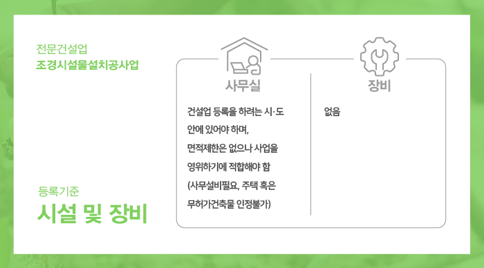 조경시설물설치공사업 면허 등록과 사업 운영을 하는데 문제가 없는 사무실의 준비가 필요합니다.