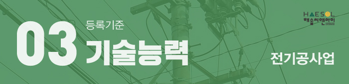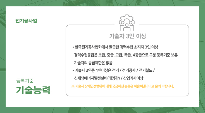 전기공사면허 기술능력 기준으로는 3인 이상의 기술자를 보유해야 합니다.