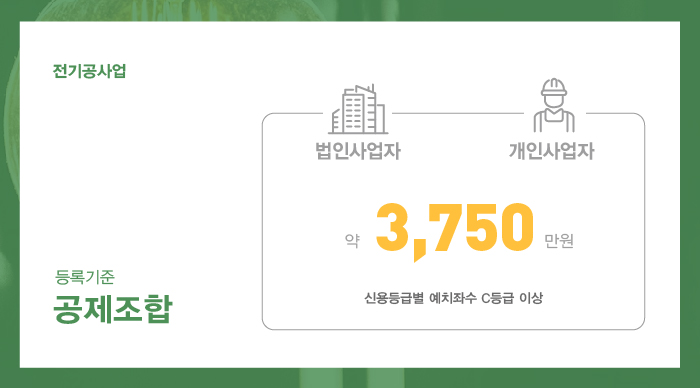 전기공사면허 등록을 위해서는 전기공사공제조합을 통해 일정 금액을 출자금으로 예치 진행하신 후 출자금예치증명원을 발급받아 면허 접수 시 제출하셔야 합니다.