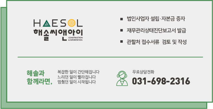 회사의 설립 시기나 형태, 겸업사업 여부, 자본금이 필요한 다른 면허의 보유 유무 등과 같이 회사가 처해진 여러 제반상황에 따라 자본금 준비 과정에 차이가 있게 되므로 해솔씨앤아이와 같은 건설경영 전문가와 함께 실질자본금에 대한 전문 지식을 바탕으로 준비하시는 것을 권장드립니다.