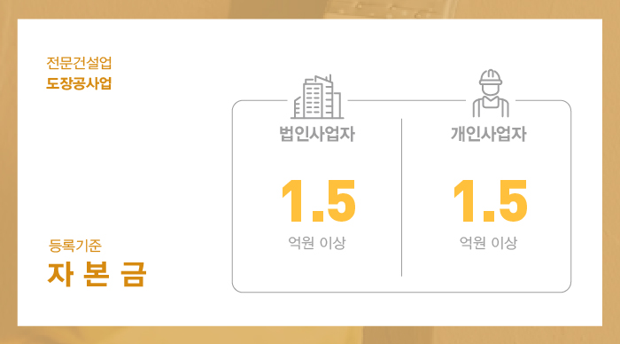 도장공사업 면허 등록의 진행을 위해서는 법인과 개인사업자 모두 1억 5천만원 이상의 자본금 준비가 필요합니다.