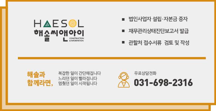 해솔씨앤아이는 법인사업자 설립부터 자본금 증자, 기업진단보고서 발급, 관할처 접수서류 검토 및 작성에 이르기까지 면허 등록을 위한 모든 과정에 도움을 드리고 있습니다.