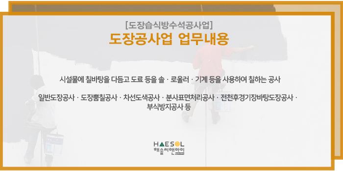 도장공사업의 업무 범위는 시설물에 칠바탕을 다듬고 도료 등을 솔, 로울러, 기계 등을 사용하여 칠하는 공사가 해당되며 이를 진행하기에 앞서 건설산업기본법에 따라 공사예정금액 1,500만원 이상의 공사를 진행하고자 할 경우 반드시 해당 공사업 면허를 보유해야 합니다.