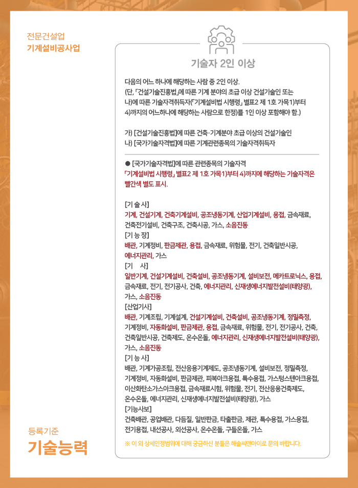 기술자는 한국건설기술인협회에서 발급하는 기계 분야 초급 이상의 경력수첩 소지자 또는 관련 종목의 국가기술자격증 소지자 (빨간색으로 표시) 필수 1명 포함하여 2명 이상이 준비되어야 하는데, 인정 가능한 국가기술자격증의 범위가 매우 다양하므로 소지하신 자격증의 정확한 이름을 토대로 해솔씨앤아이로 문의주시면 적격 가능여부를 안내드리겠습니다.