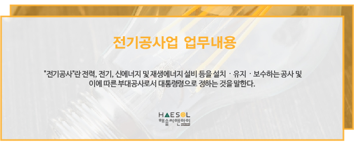 전기공사업면허 취득에 대한 더 자세한 내용이 궁금하시거나, 도움이 필요하시다면 건설면허 전문가 해솔씨앤아이로 문의주시기 바랍니다.