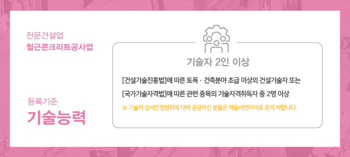 기술인력의 경우 면허 등록 시 뿐만 아니라, 면허 등록 이후에도 상시 유지되어야 하는 부분이기 때문에 기술인력의 퇴사 등으로 인하여 등록기준에 공백이 발생될 경우 발생일로부터 50일 이내 자격요건을 충족하는 새로운 기술인력이 충원되어야 하는 점 반드시 기억하여주시기 바랍니다.