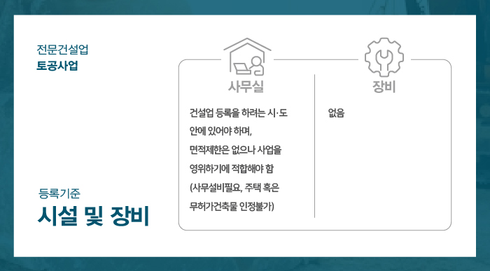 사무실은 토공사업 면허 등록을 하고자 하는 시/도 내에 위치한 곳으로 건축법상 용도가 업무시설(사무소) 또는 근린생활시설로 명시 되어 사무실로써 사용이 적합한 장소로 준비가 되어야 합니다.