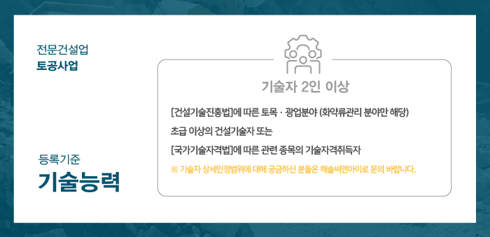 기술자 2인 이상이 준비되어야 토공사업 등록이 가능하게 됩니다.
