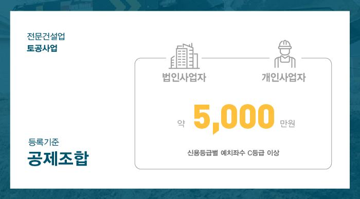 토공사업 면허 등록을 위해 법인 및 개인사업자 동일한 1억 5천만원 이상의 자본금을 준비해야 합니다.