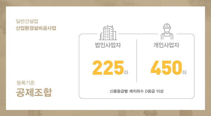 산업환경설비공사업의 경우 건설공제조합을 이용하게되며, 이 곳에 출자 예치하는 금액은 회사의 신용평가 등급에 따라 조금씩 차이가 있으나 신규로 면허를 등록하는 경우라면 기존에 별도로 평가받을 실적 등이 존재하지 않으므로 보통 미평가로 진행하여 최대좌수(법인 225좌, 개인 450좌)에 상응하는 금액을 예치하게 된다고 보시면 됩니다. '25. 07월 현재 시점 기준 건설공제조합 1좌당 금액은 1,567,000원 입니다.