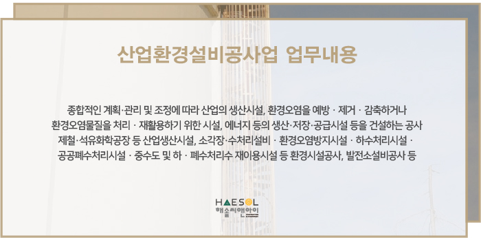산업환경설비공사업에는 종합적인 계획과 관리 및 조정에 따라 산업의 생산시설, 환경오염을 예방 · 제거 · 감축하거나 환경오염물일을 처리 · 재활용하기 위한 시설, 에너지 등의 생산 · 저장 · 공급시설 등을 건설하는 공사 등이 업무 범위에 해당됩니다.