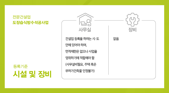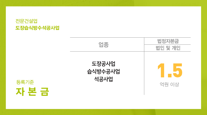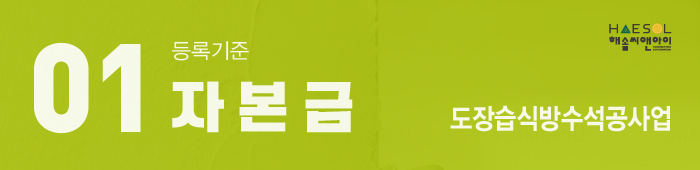 자본금 1억 5천만원 이상을 준비해야 도장습식방수석공사업 면허 취득을 하실 수 있게 됩니다.