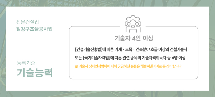 철강구조물공사업 운영이 가능한 전문 기술인력 4인 이상이 준비되어야 합니다.