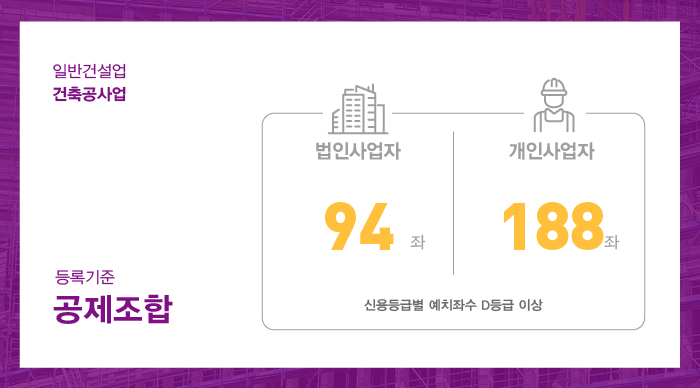 이에 따라 건축공사업은 건설공제조합에 일정 금액을 출자 예치한 후 보증가능금액확인서를 발급받아 면허 신청 시 제출하셔야 하는데, 예치되어야 할 출자 금액은 공제조합 내에서 자체적으로 실시하는 신용평가 결과 등급과 예치 시기에 따라 조금씩 상이하나, 신규로 면허를 등록하는 경우라면 기존에 별도로 평가받을 실적이 존재하지 않기때문에 통상적으로 최대좌수에 해당하는 금액을 예치하게된다고 보시면 됩니다. (법인 94좌, 개인 188좌) '25. 07월 현재 시점 기준 건설공제조합 1좌당 금액은 1,567,000원입니다.
