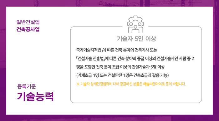 기술능력 기준으로는, 건축공사업에 규정된 자격을 갖춘 기술자 5인 이상을 보유해야 합니다.