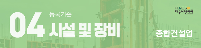 마지막으로 갖추어야 할 등록기준은 시설 및 장비 입니다. 종합건설업의 경우 특수 장비에 대한 별도의 규정이 없는 업종이므로 시설로서 사무실을 갖추어주시면 되는데, 건설업에서 규정하고 있는 사무실의 요건이 있으므로 이를 정확히 숙지하신 후 준비하시기 바랍니다.