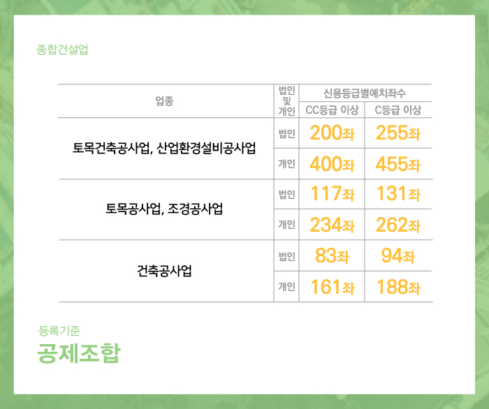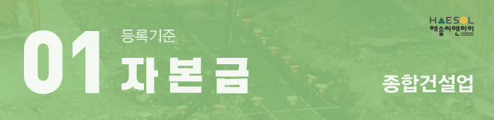 종합건설면허 등록을 위해서는 위 표에서 보시는 바와 같이 업종별로 규정된 자본금이 준비되어야 합니다.