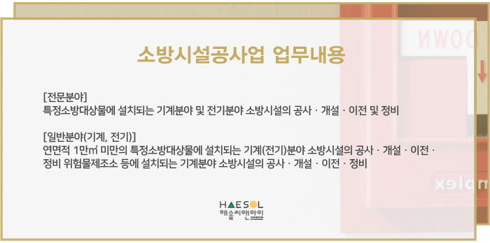 소방시설공사업은 특정 소방대상물에 설치되는 기계분야 및 전기분야의 소방시설의 공사, 개설, 이전 및 정비를 전문으로 하는 사업입니다.