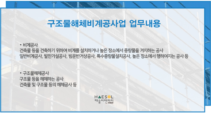 구조물해체비계공사업은 기존의 비계구조물해체공사업의 명칭이 변경된 것으로 업무 범위에는 비계공사와 구조물해체공사가 해당됩니다.