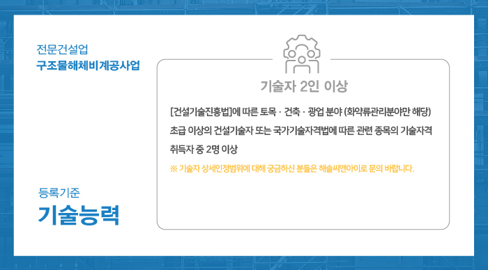 자격요건을 충족하는 기술자 2인 이상이 필요합니다.
